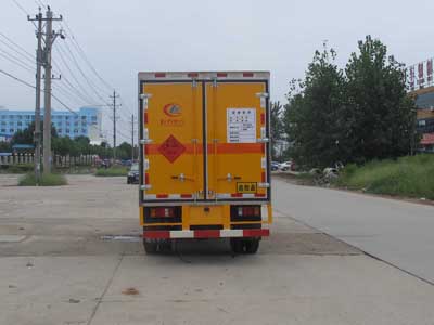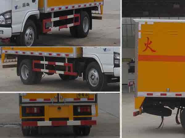 運輸品名:炸藥,雷管,類項號: 1.1D,1.1B。廂體頂部封閉不可開啟,側,后防護裝置材料材質為Q235A碳鋼,側防護與箱體底部螺栓連接,后防護裝置與車架采用焊接連接,后防護截面尺寸(mm):100×50,離地高度為430mm。安裝底盤的前置排氣管結構,安裝前輪盤式制動器,安裝子午線輪胎和帶ABS的底盤。安裝帶有衛星定位功能的行駛記錄儀。ABS系統生產廠家/型號: 浙江亞太機電股份有限公司/APG3550500A4。 |