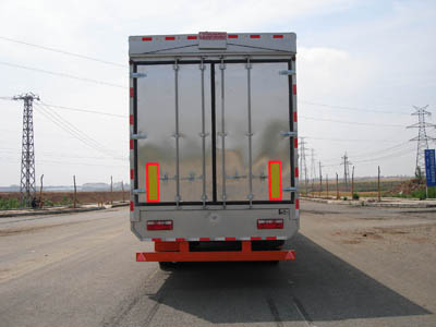 箱體頂部封閉兩翼可開啟;ABS系統生產廠家為廣州市科密汽車制動技術開發有限公司、型號為4S/2M;防護材料均為Q235-A,防護均采用焊接連接,后部防護裝置的斷面尺寸為120毫米×50毫米,離地高度為510毫米。 |