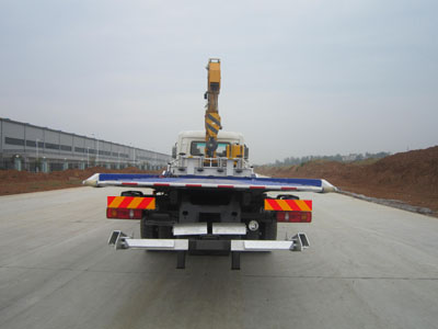 東風天錦隨車吊平板道路清障車上裝配置:起重裝置、托舉牽引裝置、液壓系統、電控系統、車體與工具箱等組成,具有起吊、拽拉和托舉牽引等多項功能。