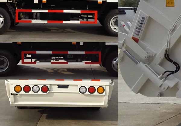 東風銳鈴6方國五壓縮式垃圾車采用東風國五環衛車專用底盤:3308mm軸距,車輛保證為正常東風公司本部商品車狀態,配備朝柴發動機100馬力,按公告尺寸制作,五檔變速箱,7.00-16 14PR輪胎,其他按東風公司標配。