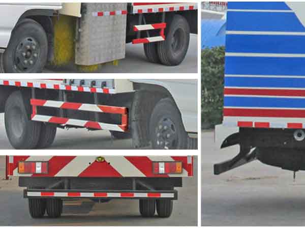 防護材料:Q235A碳鋼,連接方式:左右側面及后下部防護均采用焊接連接,后部防護斷面尺寸(mm):100×50,后部防護離地高度(mm):380。隨底盤選裝駕駛室 |