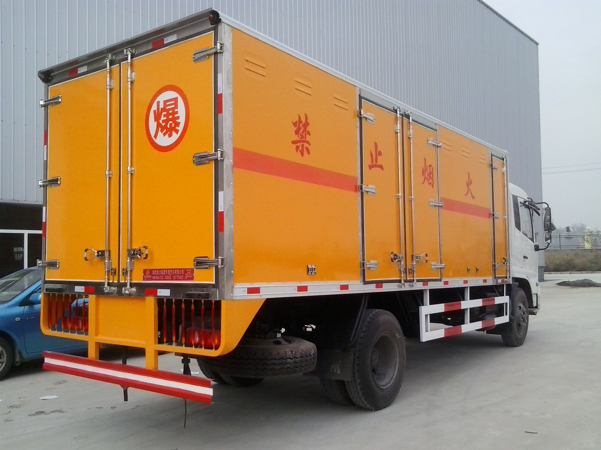 東風天錦9.98噸防爆車|民爆車.廂體頂部密封,不可開啟。有燃油公告,環保公告, 廂體外飾冷軋鋼板,內飾防靜電鋁板,底板鋪防靜電膠板,側壁設防雨通風窗口,帶捆綁固定拉環,煙霧感應器,防盜報警開關,靜電帶,滅火器2只,車廂黃色或白灰,有危險標志,貼有反光標識,廂體右側開側門,可選裝無側門廂體、帶隔倉箱體。駕駛室選裝白色,箱長6.1米。其他按國家爆破器材運輸車標準執行(底盤前盤(碟)后轂、電子限速器、行駛記錄儀、ABS)。