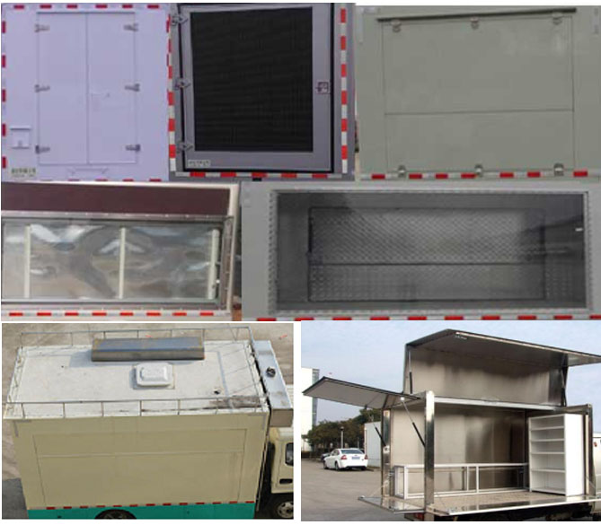 車輛顏色可選,文字噴涂位置可變化,車廂頂部選裝天窗、排煙罩,排氣口,護欄,水箱,護欄;整車外觀噴涂或粘貼宣傳標識;廂內內部設備可根據用戶要求定制如發電機,冰柜,冷飲機,售貨臺,炊具等;左側右側后側選裝不同結構形式的側翻門、吧臺、舞臺、遮陽板、裝玻璃窗、亦可選裝LED屏舉升或者不舉升;前部選裝水箱;后部選裝LED屏,或者選裝百葉窗,爬梯,或者上翻或者側翻門;隨底盤選裝駕駛室。該車選用軸距:4100,3800。ABS型號:ABS/ASR-24V-4S/4M,廠家:襄陽東風隆誠機械有限責任公司。 |