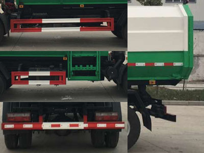 選裝同系列排半駕駛室,選裝導流罩,選裝前面板新風格.垃圾廂顏色和外觀可變化,選裝裝料機構,選裝后門開啟方式. 側,后防護裝置材料材質為碳鋼/Q235B;與副梁采用螺栓加焊接連接;后部防護裝置斷面尺寸(寬×高)50×110(mm),ABS型號為3631010-C2000,生產廠家為東科克諾爾商用車制動系統(十堰)有限公司.后部防護離地高度:480mm. |