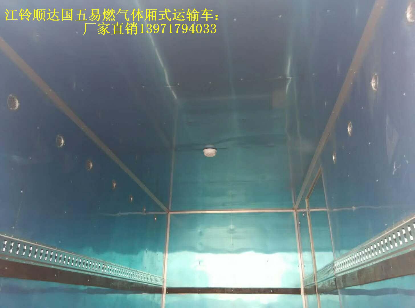 江鈴順達易燃氣體廂式運輸車廂體外飾冷軋鋼板,內飾防靜電鋁板,底板鋪防靜電膠板,側壁設防雨通風窗口,帶捆綁固定拉環,煙霧感應器,防盜報警開關,靜電帶,滅火器2只,車廂黃色,有危險標志,貼有反光標識。