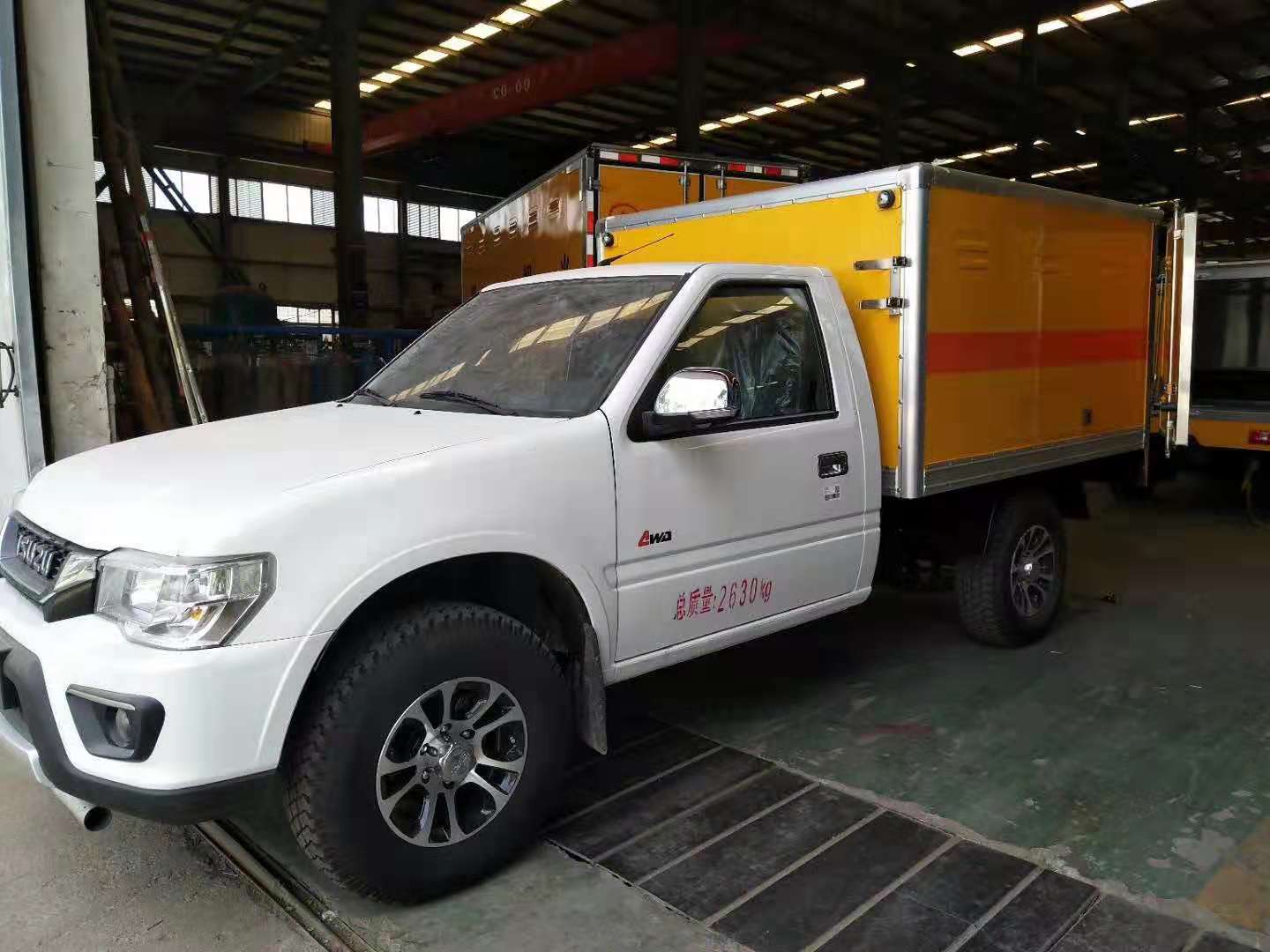 慶鈴五十鈴皮卡爆破器材運輸車,防爆車/民爆車是爆破器材運輸車的一種,國五排放.廂體頂部密封,不可開啟。僅采用慶鈴五十鈴130馬力發動機。箱內尺寸2100×1675×1060(mm),五擋箱215/75R15,235/75R15真空輪胎,中控鎖+手動車窗+方向助力。其他按國家爆破器材運輸車標準執行(底盤前盤(碟)后轂、電子限速器、行駛記錄儀、ABS),排氣管前置。有燃油和環保公告,上戶無憂。 慶鈴五十鈴皮卡爆破器材運輸車防爆車/民爆車廂體外飾冷軋鋼板,內飾防靜電鋁板,底板鋪防靜電膠板,側壁設防雨通風窗口,帶捆綁固定拉環,煙霧感應器,防盜報警開關,靜電帶,滅火器2只,車廂黃色,有危險標志,貼有反光標識。