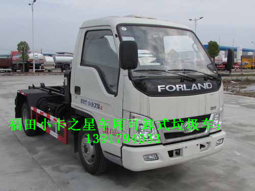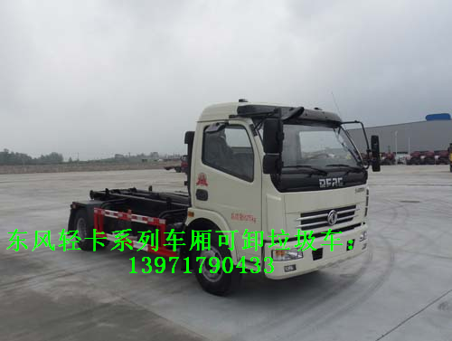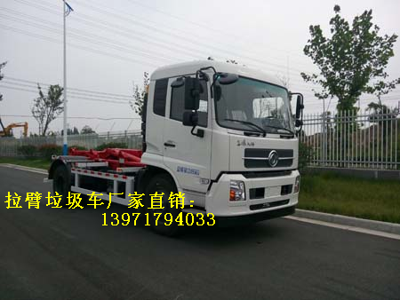 例如:東風拉臂式垃圾車是車廂可卸式垃圾車的一種,利用翻轉架與活動拉臂把垃圾箱拉到附車架上,用側向導向塊定位及鎖緊鉤鎖緊定位,整車行駛中箱體無歪斜現象,具有結構簡單、操作穩定方便、裝卸效率高、機械化程度高、節省人力的優點。