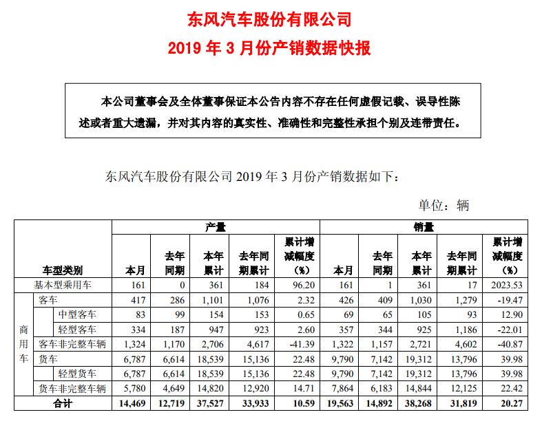 前日,東風(fēng)股份發(fā)布2019年3月產(chǎn)銷快報(bào)。數(shù)據(jù)顯示,東風(fēng)股份前3月累計(jì)生產(chǎn)汽車37527輛,同比增長10.59%,累計(jì)銷售汽車38268輛,同比增長20.27%,其中銷售客車(不含非完整車輛)1030輛,同比下滑19.47%;累計(jì)銷售貨車(不含非完整車輛)19312輛,同比增長39.98%。