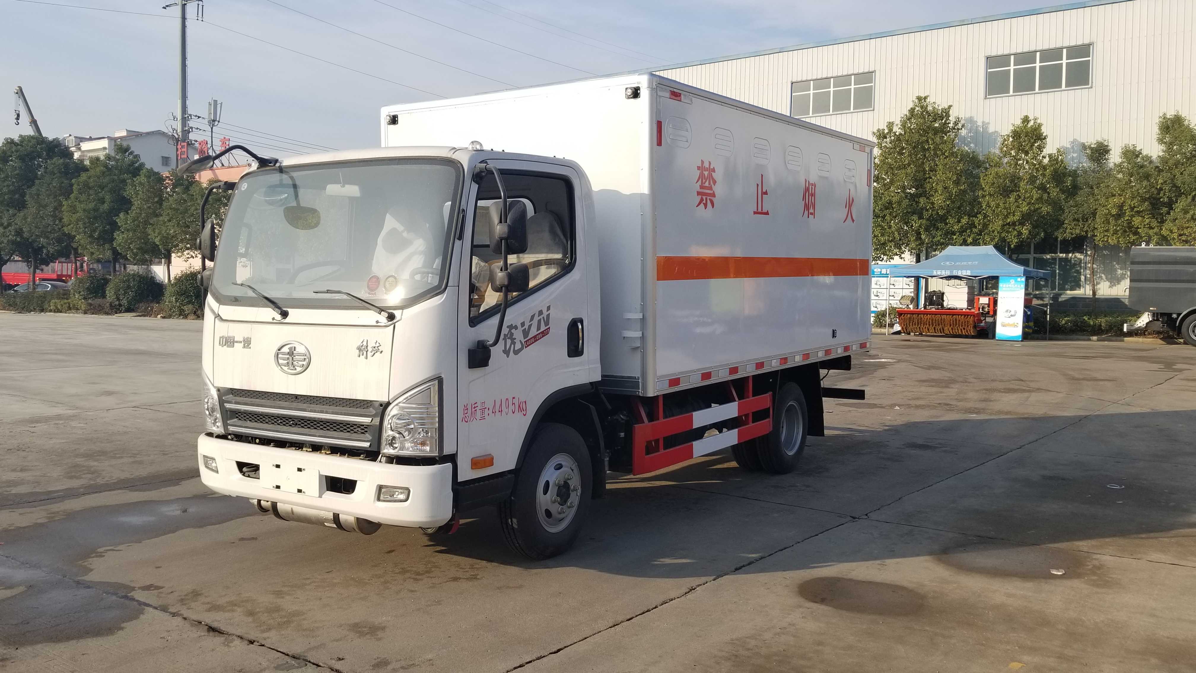 解放虎VN爆破器材運輸車/防爆車/民爆車底盤配置:解放虎VN寬體3人座駕駛室,3300軸距,濰柴110馬力國五發(fā)動機,5檔變速箱,4噸后橋,7.00R16鋼絲胎,斷氣剎,空調,方向助力,ABS,限速80,前盤制動,排氣管前置等